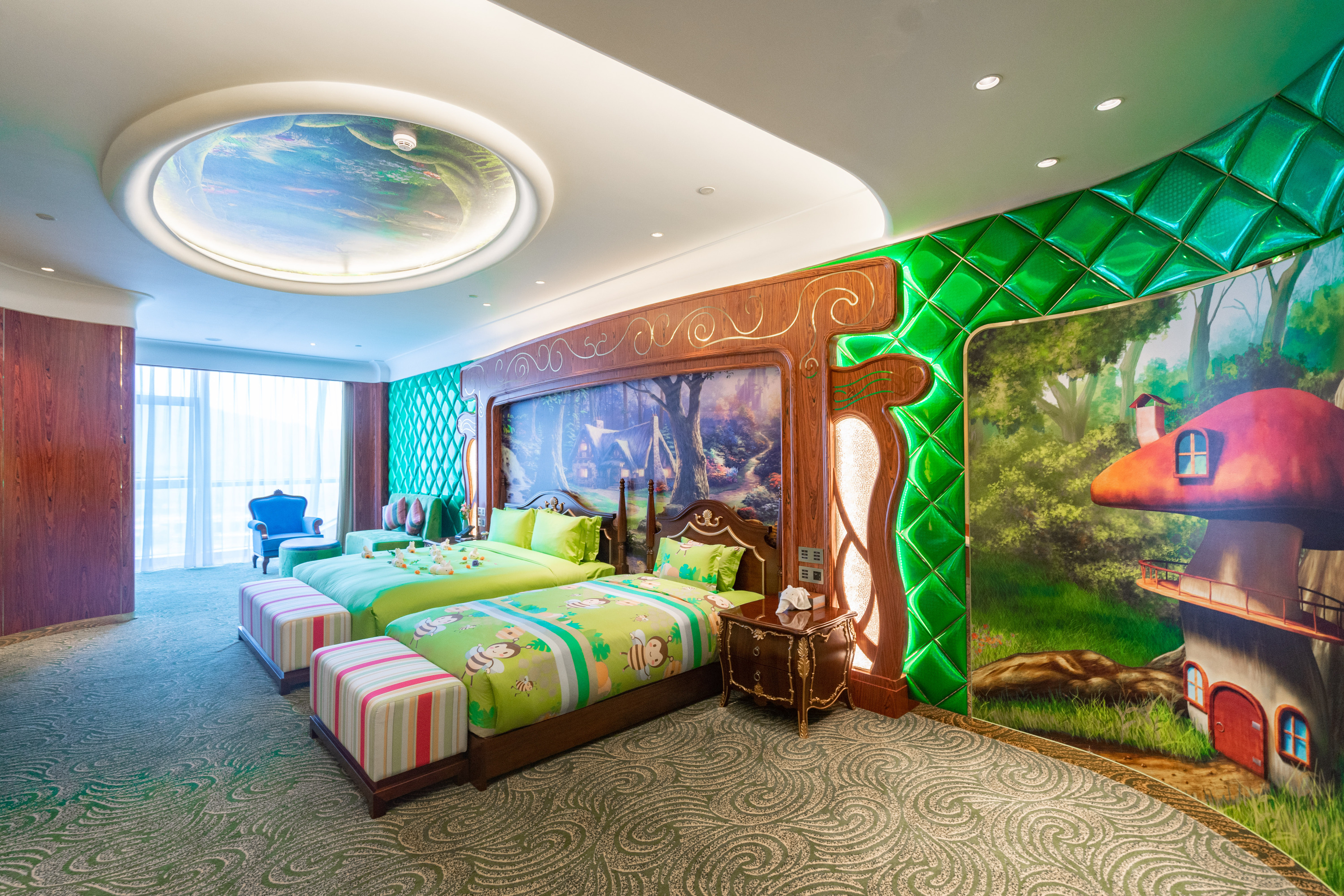 南京蜂巢酒店客房设计独特,空间延续了蜂巢酒店公共空间的设计及流线型的整体设计手法。拥有176间主题亲子房和320间商务用房。同时酒店正在打造的全亚洲的悬崖无边泳池和悬崖客房。宴会厅的平面呈现一个椭圆形,寓意圆满。整个宴会厅面积2000平米,能容纳1000多人的豪华宴会,墙面采用阵列的设计手法,和整体的空间统一起来,玛瑙石运用在墙面的装饰中体现了空间的豪华感,天花板设计的灵感来源于蝴蝶,四根直立的灯型宛如蜜蜂的尾针,与蜂巢酒店主题相呼应。