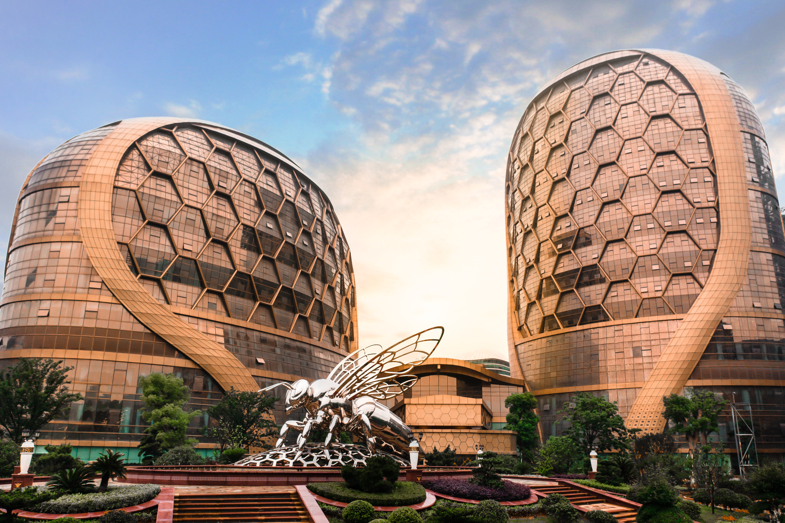 南京蜂巢酒店坐落在南京老山之巅,酒店理念是生态修复,设计灵感来源于老山地区知名品牌蜂蜜。建筑面积约有八万五平方。两只石狮俯卧在酒店两侧,宛如守护神一般,象征守护一方平安。